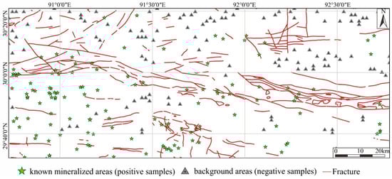 Based on the gridded method of GIS spatial analysis, a 2 km × 2 km grid was used to divide the study divisions into 4848 prediction units, each containing 43 features in Table 1. ML-based MPM is a classification process that calculates the probability with each prediction unit belonging to either the ‘mineral’ or ‘non-mineral’ category [7]. Selecting the appropriate training samples is one of the keys to successful prediction. The positive samples are prediction units that contain the ore points, and the number is relatively limited. Non-mineralization is a frequent phenomenon, differentiating areas from mineralized areas. Negative samples were randomly chosen from regions away from mineralization zones, tectonic areas, and areas with low contents of main ore-forming elements.