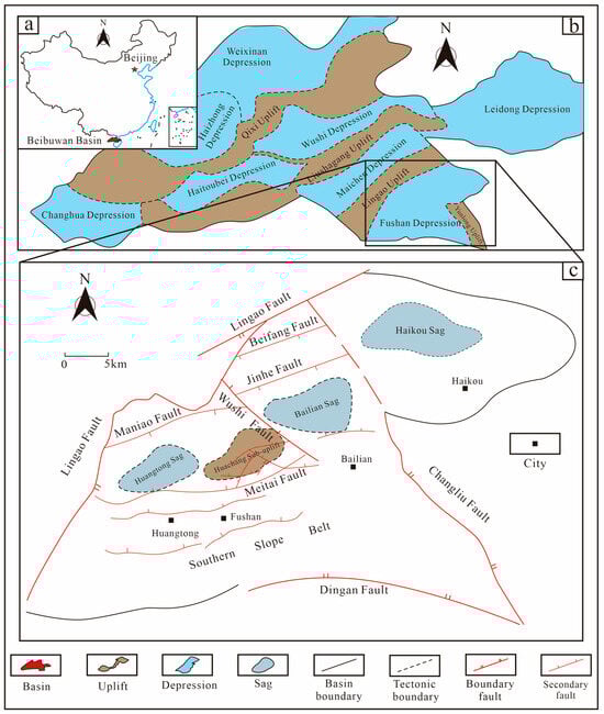(a) Location of the Beibuwan Basin. (b) Location of the Fushan Depression (modified after [56]). (c) Location of western Huangtong Sag, eastern Bailian Sag, central Huachang Sub-uplift, and Southern Slope Belt in the Fushan Depression (modified after [57]).