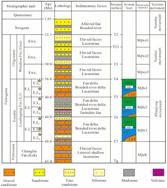 Stratigraphic column of the Fushan Depression (modified after [13]). E2L1, E2L2, and E2L3 are Members 1, 2, and 3 of the Eocne Liushagang Formation. According to the lithological characteristics and the production demand of China‘s oil fields, it is divided into the E2L3X, E2L3Z, E2L3S, E2L2X, E2L2S, E2L1X, and E2L1S sequentially from the top to bottom of Eocene source rocks.