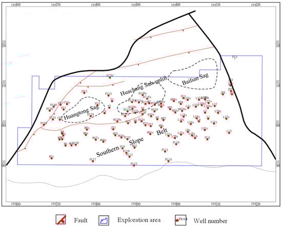 The Palaeogene Changliu Formation, Liushagang Formation, and Weizhou Formation, along with Neogene and Quaternary sediments, have been sequentially deposited upon the Cretaceous basement in the Fushan Depression. Notably, the Liushagang Formation, characterized by its lacustrine deltaic deposits, serves as the principal source of oil and a key reservoir within the Fushan Depression [58,59]. The Eocne Liushagang Formation was categorized into three members in this area, namely, E2L1, E2L2, and E2L3. It is divided into E2L3X, E2L3Z, E2L3S, E2L2X, E2L2S, E2L1X, and E2L1S sequentially, and hydrocarbon source rocks are developed in these layers [60], among which E2L1 and the E2L3 are the main oil- and gas-producing layers [13] (Figure 2). The boreholes examined in this study are predominantly located in the onshore regions of structural highs, encompassing the sedimentary core of the western Huangtong Sag, the central Huachang Sub-uplift, and the elevated Southern Slope Belt [61,62]. The objective is to ascertain the distribution and stratigraphic variations in the source rocks within the onshore areas. Controlled by the Meihua fault, E2L3 in the eastern Huangtong Sag is denuded. The northern sea area is the subsidence center of the Bailian Sag in the northeast. The distribution range of the non-well area is wide, and the basic data on lithology and layer thickness are lacking [3].