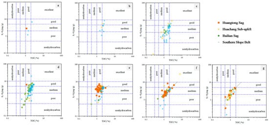 Relationship between total organic carbon content and hydrocarbon generation potential of source rocks in the Huangtong Sag, Huachang Sub-uplift, Bailian Sag, and Southern Slope Belt in the Fushan Depression. The E2L2X stratigraphic sub-section exhibits superior geological parameters compared with its counterparts, indicating significant hydrocarbon generation potential. (a) E2L3X source rocks; (b) E2L3Z source rocks; (c) E2L3S source rocks; (d) E2L2X source rocks; (e) E2L2S source rocks (f) E2L1X source rocks; and (g) E2L1S source rocks (after [74]).