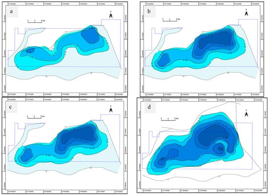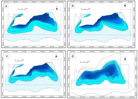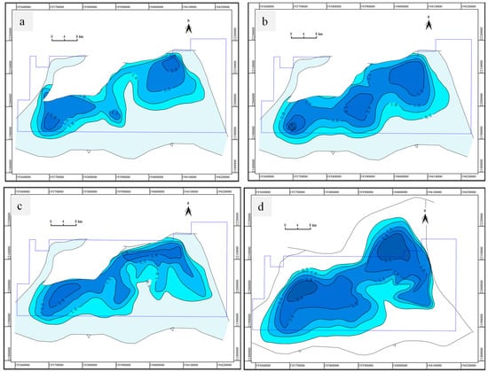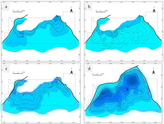 The stratigraphic thickness of the dark mudstone serves as a pivotal determinant in ascertaining the thickness of the effective source rocks [61]. The areal extent and stratigraphic thickness of E2L3, characterized by dark mudstone, are significantly less extensive than those of E2L1 and E2L2. The northern strata of the E2L3 formation have been eroded along the fault line. During the depositional phases of the E2L3X and E2L3Z members, a singular subsidence center was established in the northeastern part of the Bailian Sag, where the sedimentary thickness is predominantly concentrated. This could be attributed to the influence of the Meihua Fault, with source supply from the northwest and southwest directions [54]. Within E2L3S, the Huangtong and Bailian Sags are characterized as two principal subsidence centers. Initially, during the depositional phase of the E2L2X formation, the expanse of dark mudstone in the deep-depression zone, specifically in the northern sector adjacent to the Meihua Fault, exhibited a more extensive distribution. At present, the subsidence center remains constant. Because of the relatively deep and stable hydrosphere, there is extensive development of thick dark mudstone within the reducing environment. For example, the thickness of the dark mudstone in the H18X well is 360 m, which is 100% of the thickness of the E2L2X formation, and the whole section is dark mudstone. Affected by the southern provenance [61], the distribution range of E2L2S in the Huangtong Sag becomes smaller; however, the dark mudstone of fan delta plain facies with a thickness of 570 m is developed in the C4X well. The thickness of source rock in the Huachang Sub-uplift is high, and the thickness of the E2L2S source rock is larger than that of the other layers. Under the condition that the subsidence center of E2L1X is unchanged, the thickness of the source rock in the deep depression area is smaller than that in E2L2. The hydrocarbon charge to the Huachang Sub-uplift, located in the southern sector of the E2L1S, has experienced a reduction in source input, resulting in the re-establishment of two subsidence centers, while concurrently, the areal extent of the source rock has diminished. Overall, the source rocks of the Liushagang Formation are mainly distributed in Sags, and the thickness and area of E2L2 source rocks are the largest (Figure 10).