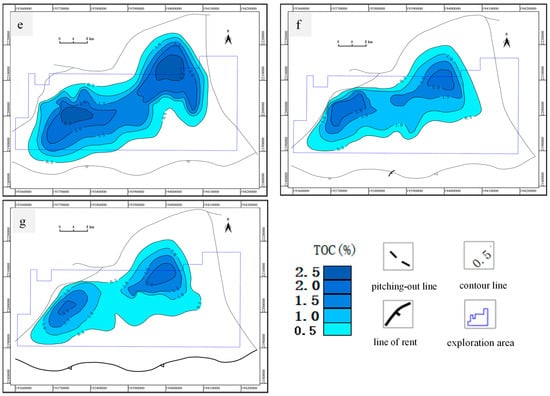 TOC contour map of the Liuliushagang Formation in the Fushan Depression. The TOC content ranges from 0.5% to 3.6%, indicating a substantial abundance of organic matter. The elevated concentrations are predominantly found within the Huangtong and Bailian Sag regions, with a gradual decrease towards the peripheral areas. The E2L2X and E2L2S strata exhibit superior characteristics compared with the other geological layers. (a) E2L3X source rocks; (b) E2L3Z source rocks; (c) E2L3S source rocks; (d) E2L2X source rocks; (e) E2L2S source rocks; (f) E2L1X source rocks; and (g) E2L1S source rocks.