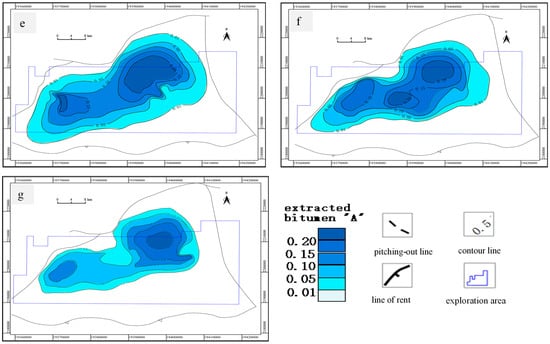 Extracted bitumen A contour map of the Liushagang Formation in the Fushan Depression. The extracted bitumen A content ranges from 0.01% to 0.54%, indicating a substantial organic matter abundance. The highest concentrations are predominantly found within the Bailian Sag, while the Huachang Sub-uplift exhibits elevated values in the E2L2X and E2L2S intervals, as well as in the E2L1X stratigraphic unit. (a) E2L3X source rocks; (b) E2L3Z source rocks; (c) E2L3S source rocks; (d) E2L2X source rocks; (e) E2L2S source rocks; (f) E2L1X source rocks; and (g) E2L1S source rocks.