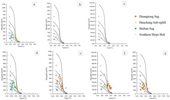 The relationship between HI and Tmax of source rocks in the Huangtong sag, Huachang Sub-uplift, Bailian Sag, and Southern Slope Belt in the Fushan Depression. The predominant type of organic matter is classified as type II2. (a) E2L3X source rocks; (b) E2L3Z source rocks; (c) E2L3S source rocks; (d) E2L2X source rocks; (e) E2L2S source rocks (f) E2L1X source rocks; and (g) E2L1S source rocks. Thermal maturity of organic matter (after [24]).