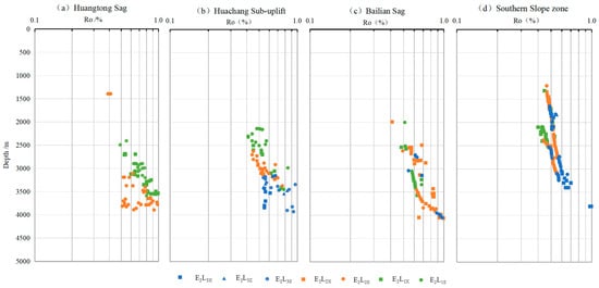 Variation in the vitrinite reflectance of source rocks of E2L3X, E2L3Z, E2L3S, E2L2X, E2L2S, E2L1X, and E2L1S sequentially with depth in the Fushan Depression. (a) Huangtong Sag, (b) Huachang Uplift, (c) Bailian Sag, and (d) Southern Slope Belt. The overall variation in the Rock-Eval pyrolysis parameter, Ro, exhibits a positive correlation with the increase in burial depth.