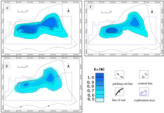 Ro plane contour map of source rocks in the Liushagang Formation in the Fushan Depression. The region of elevated Ro values is situated within the Huangtong Sag and the Bailian Sag. There is a gradual decrease in Ro values from these high-value areas towards the periphery of the respective depressions. (a) E2L3X source rocks; (b) E2L3Z source rocks; (c) E2L3S source rocks; (d) E2L2X source rocks; (e) E2L2S source rocks; (f) E2L1X source rocks; and (g) E2L1S source rocks.