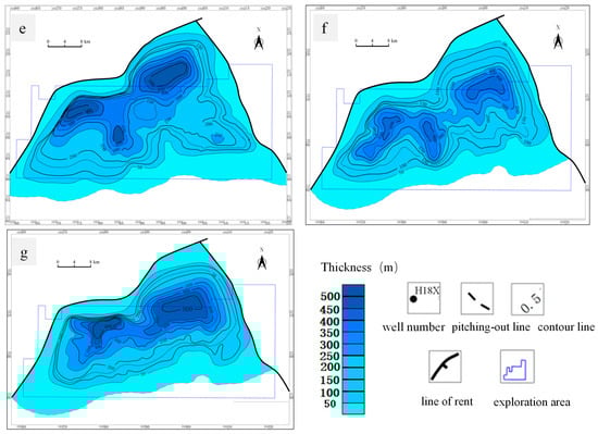 Source rock thickness contour map of the Liushagang Formation in the Fushan Depression. Influenced by the Meihua Fault, the provenance rocks of the Early Liushagang Formation in the northern region underwent significant denudation. The depositional center and the area of maximum thickness of these source rocks are observed in the Huangtong Sag and the Bailian Sag, respectively. (a) E2L3X source rocks; (b) E2L3Z source rocks; (c) E2L3S source rocks; (d) E2L2X source rocks; (e) E2L2S source rocks; (f) E2L1X source rocks; and (g) E2L1S source rocks.