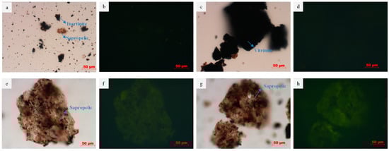 Microscopic identification of kerogen macerals and types of the Liushagang Formation in the Fushan Depression. (a) Y13X in the Huangtong Sag, E2L1, 3586.7 m, type III kerogen. The inertinite macerals can be observed, and (b) the sapropel group is not strongly reflected under fluorescence. (c) H7X in the Huachang Sub-uplift, E2L1, 2401.62 m, type III kerogen. (d) The vitrinite macerals can be observed. (e) Y7X in the Huangtong Sag, E2L1, 3744.12 m, type II2 kerogen; (f) Development of sapropelic macerals. (g) H7X in the Huachang Sub-uplift, 3448.67 m, E2L3, type II2 kerogen. (h) Compared with E2L1, more sapropelic macerals were developed.
