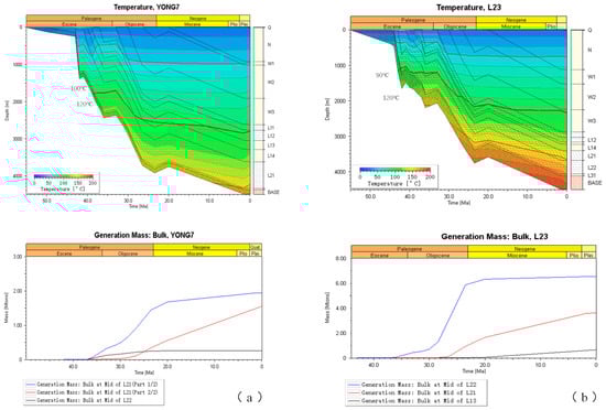 The Yong 7X well, located in the western sector of the study area, demonstrates evidence of burial following the sedimentation of the E2L2 formation. It experienced three transient uplift and denudation events at 42–41 Ma, 36–33 Ma, and 23.5–20 Ma, separately, before entering a phase of rapid burial. Hydrocarbon generation in the Yong 7 well began around 37 Ma, stabilizing at 25 Ma. E2L2S source rocks also initiated hydrocarbon generation around 37 Ma, with a significant increase in the generation rate compared with the lower sub-member of Liu II, reaching the expulsion threshold around 28 Ma and commencing hydrocarbon expulsion. Tectonic events, such as the Zhuqiong movement of the Hainan Uplift at 36 Ma and 23.5 Ma, temporarily weakened or halted hydrocarbon generation and expulsion. The process resumed after further burial, with the restart time in the Huangtong Sag at 33 Ma and 20 Ma, respectively.