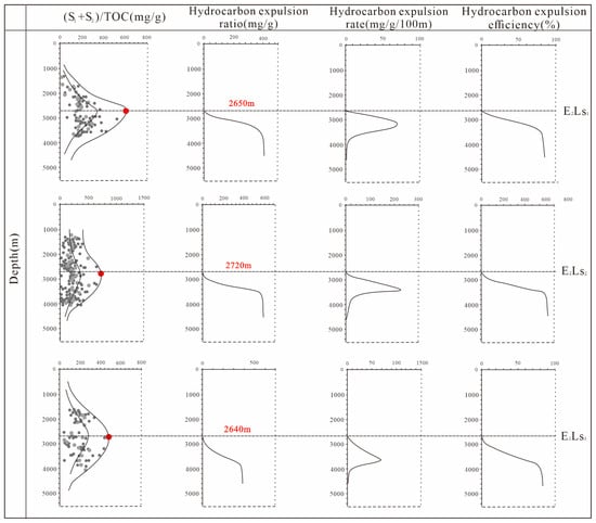 Hydrocarbon expulsion model of the Liushagang Formation in the Fushan Depression, the red spot is the hydrocarbon expulsion threshold to restore the maximum hydrocarbon generation potential index. Upon reaching the critical depths where the source rock crosses the thresholds for hydrocarbon generation and expulsion, the rate of hydrocarbon generation peaks at a depth of 2370 m. Conversely, at a depth of 3220 m, the expulsion rate of hydrocarbons is maximized, achieving a peak expulsion efficiency of 88%.