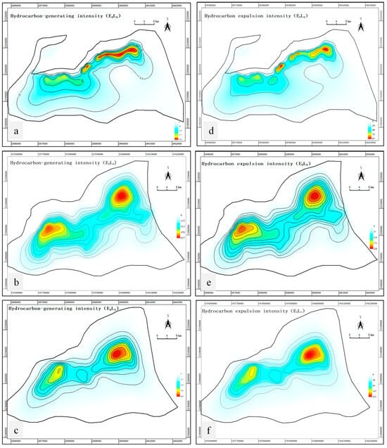 Contour map of hydrocarbon generation and expulsion intensity of source rocks in each layer of the Liushagang Formation in the Fushan Depression. (a) E2L3 source rocks; (b) E2L2 source rocks; (c) E2L1 source rocks; (d) E2L3 source rocks; (e) E2L2 source rocks; and (f) E2L1 source rocks.