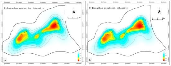 - Calculation of the amount of hydrocarbon expulsion: According to Equation (3), Ehc and the other parameters required for the calculation, such as , were put into Equation (7) for integral operation and to determine the amount of .where is the unit area of the source rock and is the hydrocarbon expulsion in each sedimentary period of the study area that can be obtained.