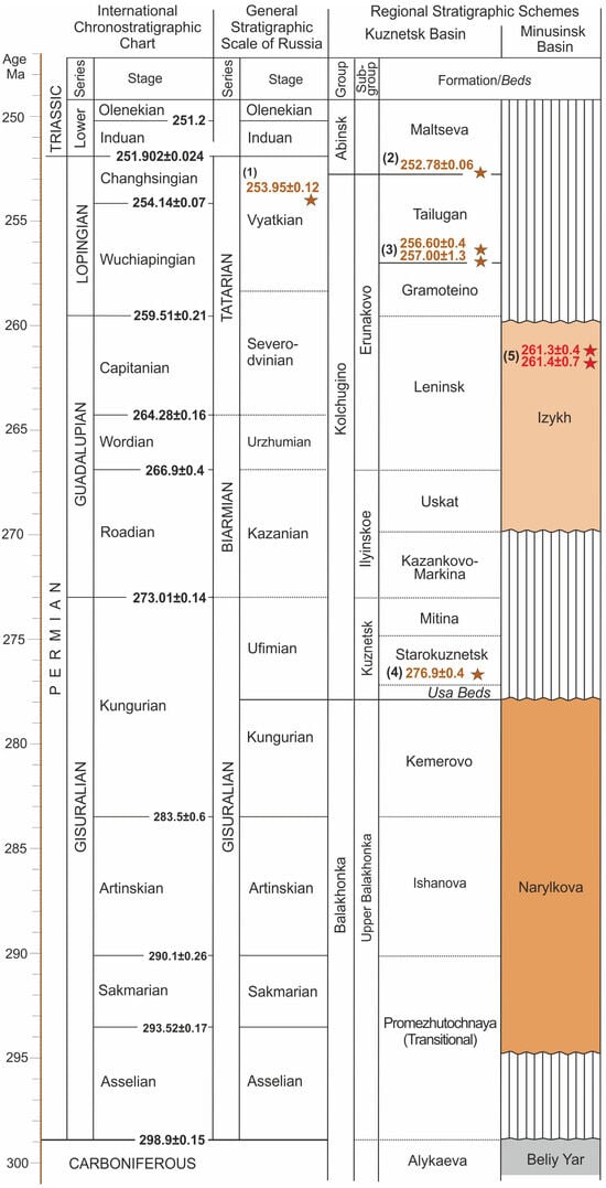 Regional stratigraphic scheme of the Permian of the Minusinsk Coal Basin [59], with modifications based on new radioisotopic datings, correlated with the Regional Scheme of the Kuznetsk Basin [60,61] and compared with the General Stratigraphic Scale of Russia [62] and the International Chronostratigraphic Chart [63]. The radioisotopic datings highlighted with star symbols are based on (1) ref. [64]; (2) ref. [30]; (3) ref. [31]; (4) ref. [32]; and (5) this article.