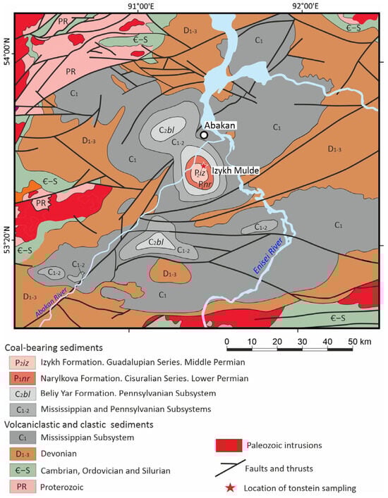 Geological map of the Minusinsk Coal Basin (simplified from [65]) and sampling location within the Izykh syncline (mulde).