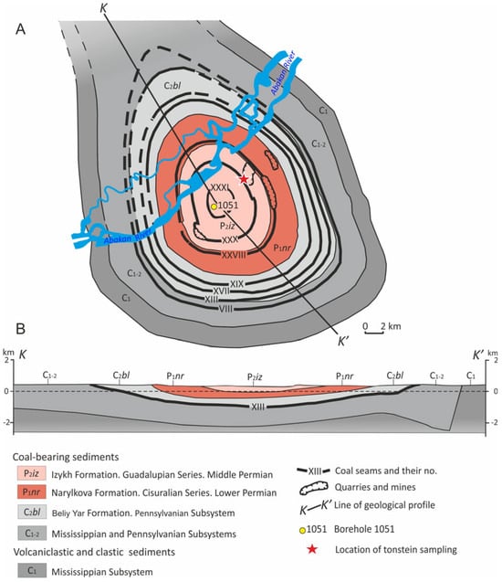 Geological map of the Izykh syncline (mulde) (A) and profile on line K–K′ (B) (simplified from [52]); sampling location is highlighted with star symbol.