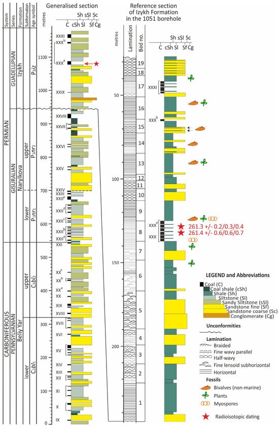 Generalised stratigraphic section of the Pennsylvanian and Permian (Cisuralian and Guadalupian) of the Minusinsk Coal Basin (compiled from [34,52,59]) (A) and the reference section of the Izykh Formation in the 1051 borehole, Izykh Coalfield (compiled by V. M. Yadrenkin in [44]); the star symbols indicate the radioisotopic dating discussed in this article.