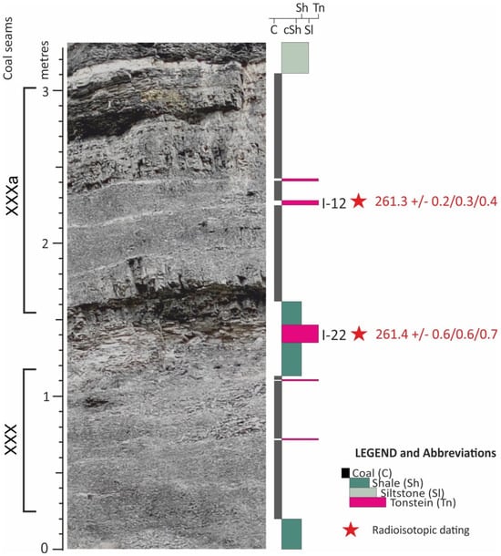 The XXX coal seam (in total 4.0–9.3 m) typically includes five to seven coal beds with a thickness of 0.1 to 6.5 m, separated by rock interlayers with a thickness ranging from 0.3 to 3.0 m. In certain locations, the XXX seam is divided into additional seams, designated as XXXa and XXXb. The coals of the XXX seam are characterised by their heterogeneity of composition, caused by the interbedding of semi-glossy, matte, and semi-matte coals. The vitrinite reflectance varies between 0.58% and 0.62%, which corresponds to the first stage of coal metamorphism [52]. The XXX seam contains a number of tonsteins (from 1 to 30 cm thick) which were sampled for zircons (see the Materials Section).