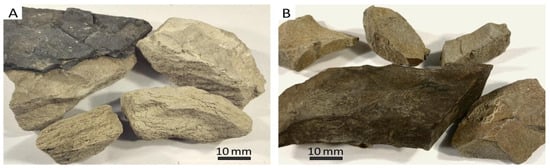 Tonstein samples from the coal seams XXXa and XXX: (A) tonstein I-12; the upper left sample retained contact with the adjacent coal, and (B) tonstein I-22; the darker sample is wet.