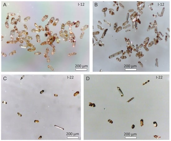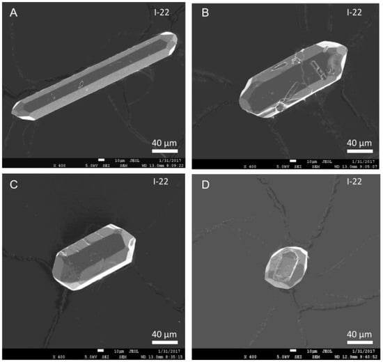 General Description of Zircon Crystals. The study of zircon grain populations from tonstein I-22 (60 grains) and tonstein I-12 (100 grains) using optical and scanning electron microscopes revealed in both cases the predominance of medium prismatic crystals (60% and 45%, respectively), with length-to-width ratios ranging from 2 to 4. Short prismatic crystals, with length-to-width ratios less than 2, are subdominant, accounting for 30% and 35%, respectively. Long prismatic crystals, with a length-to-width ratio greater than 4, account for 10% and 20%, respectively. Most grains (about 85%) have well-developed {101}–{211} pyramids. Photographs of crystal populations and individual grains are shown in Figure 9, Figure 12 and Figure 13.
