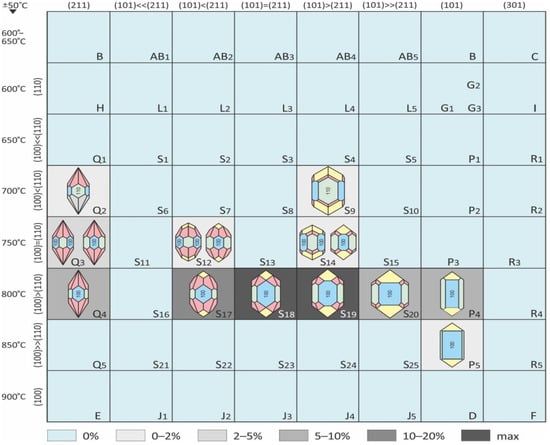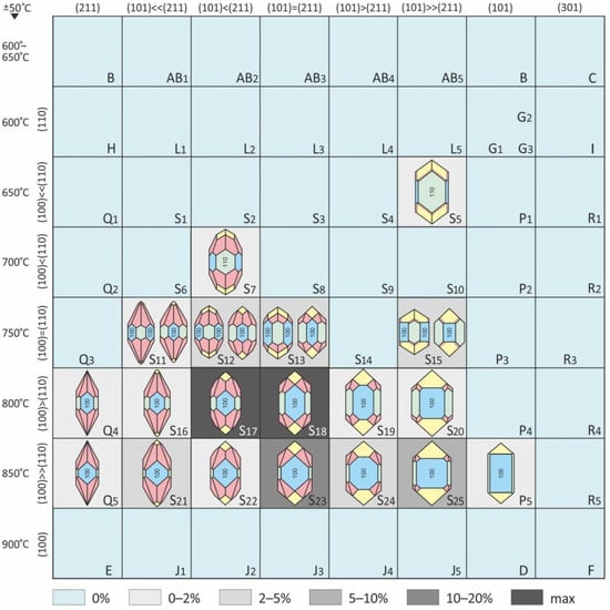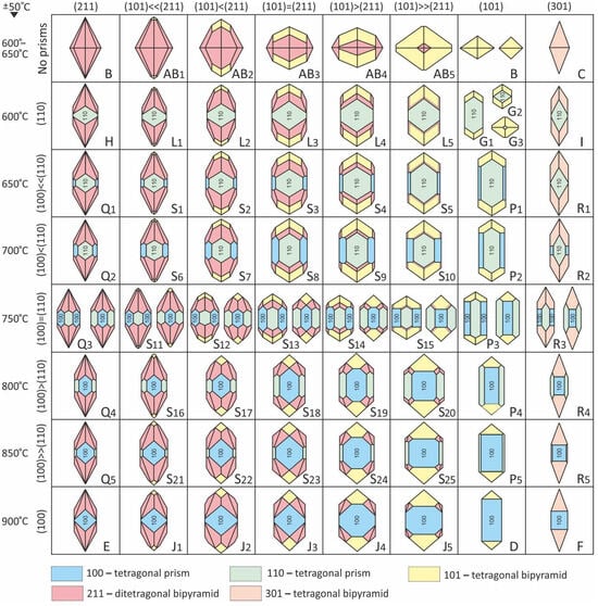 Main types and subtypes of zircon crystals and the corresponding geothermometric scale according to J.P. Pupin [70]. The letter designations of crystal types and subtypes are provided in accordance with the classification system of J.P. Pupin (p. 209, Table 1 in [65]).