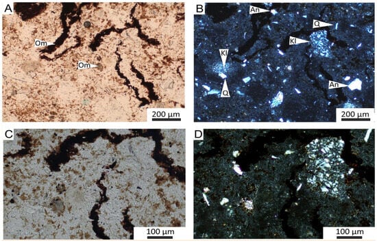 Tonstein structure in thin section: (A)—homogeneous cryptocrystalline mass of kaolinite with clusters and phenocrysts of organic matter (Om); (B)—the same in crossed nicols: An—anorthoclase; Kl—aggregates of kaolinite crystals; Q—quartz; (C,D)—the same section in higher magnification; (D)—in crossed nicols. Tonstein I-12.