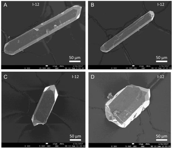 Zircon grains from tonstein I-12: (A,B)—long prismatic crystals; (C)—medium prismatic crystal; (D)—broken crystal; SEM photos.