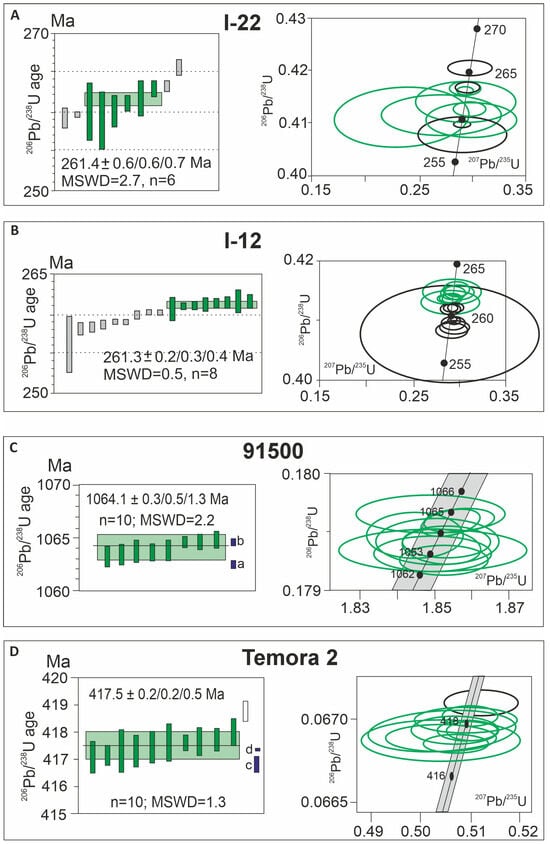Zircon Dating by Chemical Abrasion–Isotope Dilution–Thermal Ionisation Mass Spectrometry. Selected zircon grains (ca. 30–50 grains with the most idiomorphic forms) were annealed at 900 °C for 96 h and then chemically abraded at 210 °C for 12 h (sample I-22) and 14 h (sample I-12) with concentrated HF and HNO3 in a pressurised Parr dissolution vessel. This procedure dissolves crystal domains suspected of post-crystallisation lead loss by causing severe radiation damage [71].