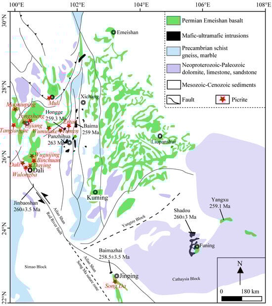 - Kamenetsky, V.S.; Chung, S.L.; Kamenetsky, M.B.; Kuzmin, D.V. Picrites from the emeishan large Igneous Province, SW China: A compositional continuum in primitive magmas and their respective mantle sources. J. Petrol. 2012, 53, 2095–2113. [Google Scholar] [CrossRef]