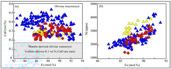 - Foley, S.F.; Prelevic, D.; Rehfeldt, T.; Jacob, D.E. Minor and trace elements in olivines as probes into early igneous and mantle melting processes. Earth Planet. Sci. Lett. 2013, 363, 181–191. [Google Scholar] [CrossRef]