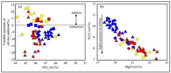 - Liu, J.; Xia, Q.K.; Sun, H.; Hanski, E.; Kuritani, T.; Gu, X.Y.; Chen, H. Compositional variation of picrites in the Emeishan large igneous province modulated by water in the mantle plume. J. Geophys. Res. Solid Earth 2022, 127, e2021JB023584. [Google Scholar] [CrossRef]