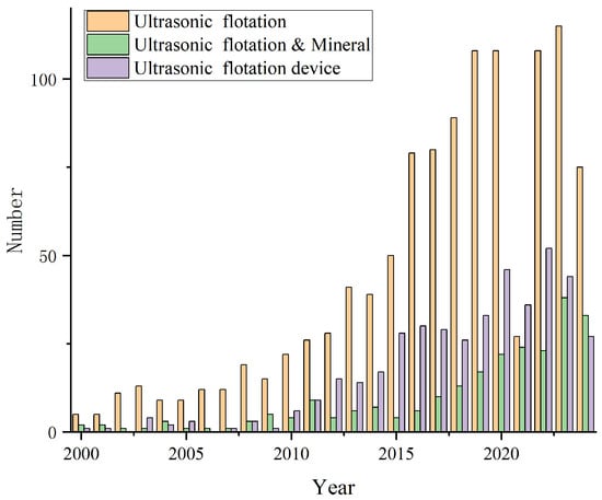 For this review, Web of Science, Elsevier and x-mol were used to screen publications, primarily based on the topics of “ultrasonic flotation”, “ultrasonic flotation & mineral”, and “ultrasonic flotation device”. The references for ultrasonic flotation devices are mostly from patents, and few existing journal articles are dedicated to ultrasonic flotation devices. Figure 1 shows the published literature on these topics in Web of Science. It can be seen from the figure that the current ultrasonic flotation of minerals is still in the early stage, and the quantity of related literature is relatively small. The publications were manually filtered by checking the titles and reading the abstracts. The text on ultrasonic flotation devices is primarily based on patents from the last 20 years, while the remaining content on ultrasonic flotation mainly discusses journal articles from the last five years. Ultimately, 84 articles matching the topics were selected for thorough analysis and summarization.