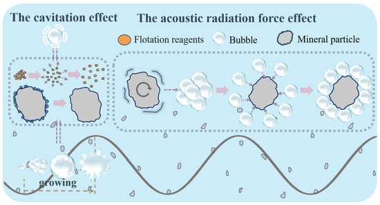 The possible effects of ultrasound flotation mainly include the transient cavitation effect, stable cavitation effect, and acoustic radiative force effect. Cavitation and acoustic radiative force are two common effects present in water during ultrasonic treatment, as shown in Figure 2. Transient cavitation requires high sound intensity (greater than 10 W/cm2) to trigger and undergo a rapid growth and violent collapse process, resulting in the formation of so-called hot spots: local high temperatures and pressures. It has a strong impact and peeling effect on the impurities on the mineral surface and can dissolve some components on the mineral surface. Stable cavitation occurs at low sound intensity, and the bubbles produce stable small-amplitude pulsations, improving the collision efficiency with fine particles, helping to remove soluble impurities from the mineral surface, and dispersing and emulsifying the flotation agent [5]. Siderite is soluble, and ts dissolution process will produce CO32−. CaCO3 is generated by CO32− and activator Ca2+ to occupy the active sites on the surface of quartz, attaching to the quartz surface such that the quartz shows the properties of calcite and reduces its hydrophobicity. Mechanical effects induced by ultrasonic cavitation can clean the surface of minerals and increase their active sites to a certain extent, thus improving their floatability [6]. By way of illustration, regarding the outcome of ultrasonic enhancement of coal gasification fine slag, ultrasonic treatment can enhance the hydrophobicity of the surface of coal gasification fine slag and increase the number of active sites on the surface, thus treating coal gasification fine slag flotation tailings more effectively [7]. In addition, microbubbles generated by ultrasonic cavitation can act as a bridge to promote the adsorption of collecting agent on the mineral surface and enhance mineral flocculation by increasing the contact angle and decreasing the zeta potential [8]. Acoustic radiation force is the movement of particles, oil, or bubbles in the ultrasonic field. Particle surface properties are altered by acoustic radiation forces in ultrasonic flotation to promote coal particle aggregation and flotation [9]. Ultrasonic flotation, under the synergistic effect of cavitation and acoustic radiation force, realizes the improvement of flotation efficiency compared with traditional flotation.