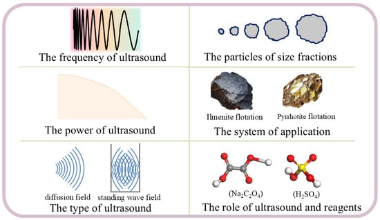 Ultrasonic flotation has been reviewed [2,3,4,5], and the application of ultrasonic in flotation, leaching, and gravity has also been systematically discussed in the literature [2], with the interaction between ultrasound and minerals and agents focused on in the flotation part. The application of ultrasound in flotation was reviewed in Ref. [3], including sludge removal, oxide film removal, desulfurization, microbubble formation, flotation agent dispersion, and aggregation. The application principle of ultrasonic technology in mineral flotation is discussed in Ref. [4], including the effect of ultrasound on minerals, flotation reagents, and slurries, as well as their application status. The mechanism of ultrasonic treatment in mineral flotation is discussed in detail in Ref. [5], including the transient cavitation effect, stable cavitation effect, and acoustic radiative force effect, as well as the influence of the main parameters of ultrasonic treatment on mineral flotation and the application of ultrasonic treatment in minerals (e.g., cleaning effect, ultrasonic corrosion, and desulfurization), flotation agents (e.g., dispersion and emulsification, and changes in the properties and microstructure of the agent solution), and slurry (e.g., microbubble formation and aggregation).