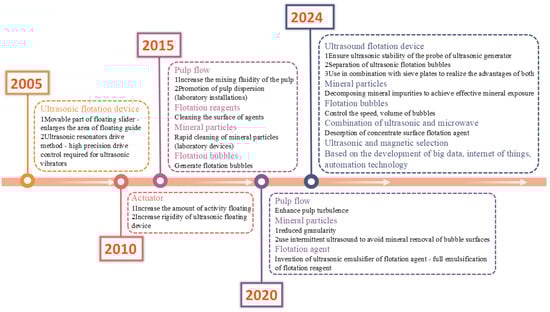 Regarding the development of ultrasonic flotation devices, there has been a progression, as shown in Figure 4, from the early simple design of ultrasonic flotation equipment, such as a movable part consisting of a floating slide to expand the area of the floating guiding surface [31], to the ultrasonic flotation process, such as an increase in the mixing degree of the slurry, to the ultrasonic flotation of minerals, such as cleaning the surface of the mineral particles [39], and then to the ultrasonic flotation of flotation equipment to achieve an emulsifying effect on the flotation reagents [48]. At present, flotation equipment is increasingly relying on the advancements in big data, the Internet of Things, automation, and other technologies. The development trend of ultrasonic flotation equipment, along with the deep integration of these three technologies, will likely become a key trend in future development. In addition, the combination of ultrasonic fields and other physical fields such as magnetic fields [67] and electric fields in ultrasonic flotation equipment is also a future development trend aimed at achieving efficient flotation of complex minerals.