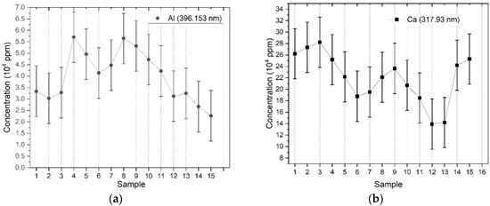 - Lazic, V.; Trujillo-Vazquez, A.; Sobral, H.; Márquez-Herrera, C.; Palucci, A.; Ciaffi, M.; Pistilli, M. Corrections for Variable Plasma Parameters in Laser Induced Breakdown Spectroscopy: Application on Archeological Samples. Spectrochim. Acta Part B At. Spectrosc. 2016, 122, 103–113. [Google Scholar] [CrossRef]