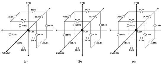 Box–Behnken experimental space (standardized factor axes) for (a) Pt, (b) Pd, and (c) Rh with the extractions at each design point and the average of the triplicate at the centre-point.