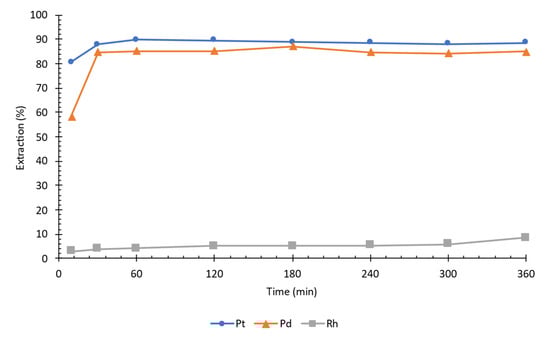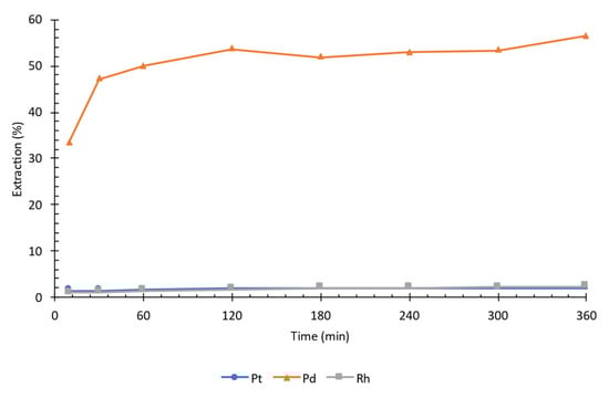 Finally, the extraction kinetics for the run giving the lowest combined PGM extraction (Run 9) are shown in Figure 4. The extractions of Pt and Rh are low and indistinguishable, and the extraction of Pd does not reach a steady state after 360 min. This result further highlights a significant positive dependency for the extraction of Pt on a high initial acid concentration.