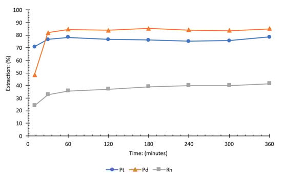 The extractions at each sample time were plotted to confirm whether complete extraction was achieved. Additionally, these plots provide an indication of the kinetics for the extractions of each PGM. Figure 2 shows the extractions for Run 10, which has the largest extractions of Pt and Pd. The extractions of Pt and Pd reached a steady state after approximately 60 min, while the extraction of Rh continued to increase over the full 360 min. This indicates incomplete extraction for Rh under these conditions, even after 360 min. The kinetics of Rh extraction are much slower those of Pt and Pd under these and all other conditions. However, extractions of Pt and Pd beyond 90% and 85%, respectively, were not achieved.