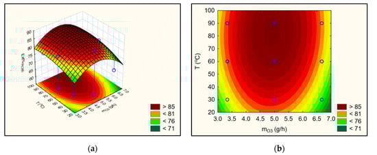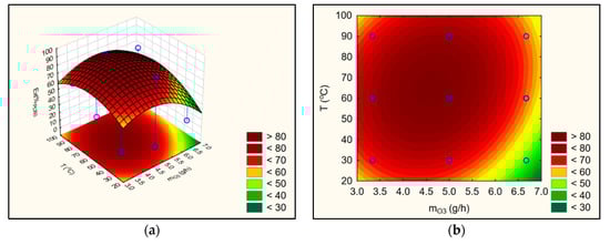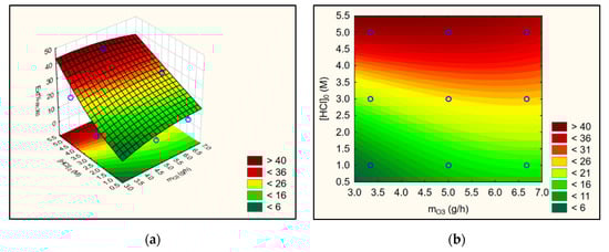 Finally, the fitted response surface for Rh extraction and the contour plots at a constant temperature of 90 °C (at which highest Rh extraction was obtained) are shown in Figure 7. No stationary point or inflection is visible in the experimental space, but the predicted numerical maximum extraction of approximately 40% is found at 3.34–6.68 g/h O3, 5.0 M, and 90 °C.