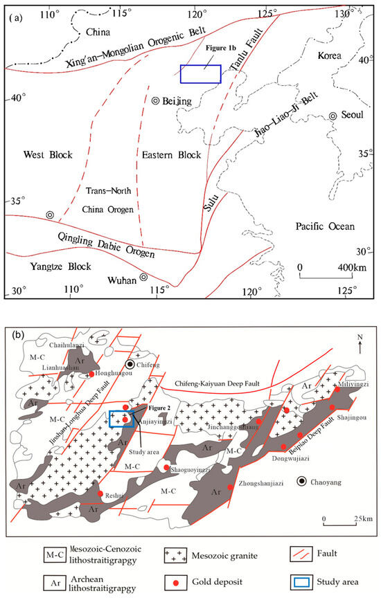 The North China Craton (NCC) margin’s gold metallogenic belt is one of the three most significant gold mineralization belts in China, with the Chifeng–Chaoyang gold metallogenetic concentration area forming a crucial part of this belt [1,2]. Numerous gold vein deposits are distributed along the NCC margins, which have historically served as important sources of gold [3]. The geological structures in this region are typically characterized by well-developed strata, intense tectonic activity, frequent magmatism across different periods, and an overall highly favorable environment for gold mineralization [4,5]. Previous studies suggest that these deposits are temporarily and genetically linked to metamorphism associated with accretionary tectonism. This is often interpreted as syn-extensional metamorphic core complexes or as a direct result of the metamorphism of the oceanic lithosphere and overlying sediments on the subducting Paleo-Pacific slab [6,7]. During the Early Mesozoic convergent deformation, ductile thrust faults developed in the ore-hosting structures, which were subsequently reactivated during the Early Cretaceous “Yanshanian” intracontinental extensional deformation, playing a key role in the formation of gold deposits [8]. Among these deposits, the Jinchanshan deposit is a unique, medium-sized gold deposit hosted in granitoids, located in the Chifeng–Chaoyang gold metallogenetic province [9]. Previous research indicates that the Jinchanshan gold deposit is closely associated with metamorphic core complexes (MCCs) and uplifted Precambrian rocks [10,11]. A widespread suite of granodiorites, dating from approximately 130 to 123 Ma, overlaps temporally with the gold deposits but shows a poor spatial association with them. The distribution and mineralization style of the gold are typical of those formed from proximal magmatic activity [8]. However, the genesis and formation age of the Jinchanshan ore-forming granitoids remain a topic of debate. Additionally, the multi-stage and long-term tectonic activity in the region is not adequately understood [10]. As a result, studies on the metallogenic magmatism and dynamic mechanism in this area are limited.
