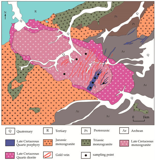 The Late Archean Jianping Group, an Au-bearing greenstone formation, constitutes the oldest basement rock in the region and controls the regional distribution of the gold deposits. The subsequent remelting of this basement and the generation of gold-bearing granites may represent the primary sources of gold enrichment [7]. The remelting of the ancient gold-bearing crystalline basement, coupled with tectonic activation during the Mesozoic platform’s reactivation, led to the widespread development of Phanerozoic granitic gold deposits in this area [7]. From the Mesozoic to the Cenozoic, the Xing’an–Mongolian Orogenic Belt transitioned into the coastal West Pacific tectonic domain. During the Late Jurassic, this region became part of the Pacific tectonic metallogenic domain, characterized by extensive brittle deformation and differential uplift, resulting in a tectonic pattern of alternating uplift and depression along an NE–NNE trend [12]. The magmatic activity during this stage featured the development of Yanshanian alkaline, syn-tectonic granites in uplifted areas and Mesozoic volcanic rocks in depressed areas.