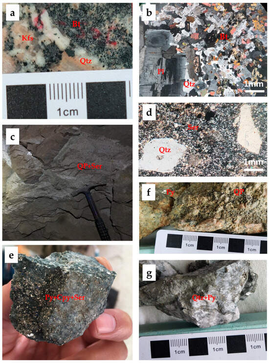 Photographs of representative rock samples of Jinchanshan deposit and relevant photomicrographs: (a,b) gray medium-grained biotite granite; (c,d) gray fine-grained quartz porphyry; (e–g) Au-bearing vein. Abbreviations: QP—quartz porphyry; Kfs—K-feldspar, Pl—plagioclase, Qtz—quartz, Bt—biotite; Py—pyrite; Cpy—chalcopyrite; Ser—sericite.