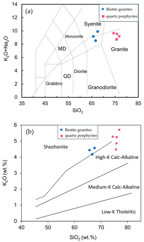 Biotite granites are widespread in the mining area, occurring as dark gray to grayish, medium-to fine-grained granites (Figure 3a,b). The grain sizes of the biotite granites range from 0.1 to 3 mm and they are primarily composed of plagioclase (25%–30%), potassium feldspar (25%–30%), quartz (25%–35%), and biotite (5%–10%), with accessory minerals such as zircon, apatite, and magnetite (Figure 3b). The plagioclase crystals are idiomorphic to sub-idiomorphic, often displaying twinning, and sometimes exhibit zoning. Potassium feldspar appears as plate-like, hemi-idiomorphic to idiomorphic crystals with common Carlsbad and albite twinning. Quartz occurs interstitially among feldspar and biotite crystals, forming irregular grains. The quartz porphyries are gray to white in color and exhibit porphyritic textures (Figure 3c,d). The primary minerals in these rocks include potassium feldspar (30%–35%), plagioclase (25%–35%), quartz (20%–30%), and biotite (5%–10%). Accessory minerals include magnetite, zircon, apatite, and monazite. Plagioclase forms the larger porphyritic grains, with sizes ranging from 3 to 10 mm. These crystals are plate-like and idiomorphic, with polysynthetic twinning observable under a microscope. The quartz grains are sub-idiomorphic, with sizes of about 2–5 mm. The matrix is primarily composed of plagioclase, potassium feldspar, and quartz, with a mineral composition similar to that of the porphyritic crystals. The matrix grain sizes typically range from 0.2 to 0.8 mm. A total of eleven fresh and minimally altered samples were collected from the Jinchanshan gold deposits, specifically from the Jinchanshan minor intrusion. These samples included both drill core samples and field outcrop samples. The samples consisted of four biotite granite samples and seven quartz porphyry samples, which were subjected to geochemical analysis. Two samples (1014-6 and 18-JC-B) were selected for zircon U–Pb isotopic analysis.