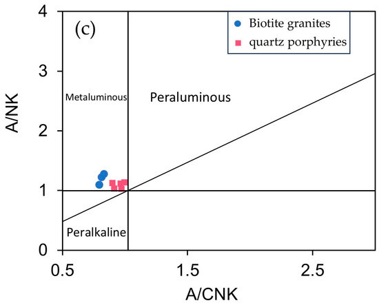 According to the analytical results (Table 1), the biotite granites from the Jinchanshan gold mine area have SiO2 content ranging from 65.68% to 67.56%, Al2O3 content from 14.72% to 15.24%, and Na2O + K2O content from 8.46% to 9.84%. The MgO content ranges from 0.65% to 1.47%, CaO from 2.76% to 3.4%, and TiO2 from 0.58% to 0.75%. Similarly, the quartz porphyry samples show SiO2 content between 74.41% and 76.85%, Al2O3 between 12.86% and 13.33%, Na2O + K2O between 8.64% and 9.59%, MgO between 0.03% and 0.09%, CaO between 0.44% and 1.02%, and TiO2 between 0.08% and 0.12% (Figure 4a). Despite the differences in their field and petrographic characteristics, the geochemical profiles of the two lithologies are somewhat similar, characterized by high Al2O3, high potassium and sodium content, and low TiO2. The K2O content of both lithologies ranges from 4.17% to 5.7%, with an average of 4.83%. The Na2O content ranges from 3.82% to 5.28%, with an average of 4.24%. The K2O content is consistently higher than that of Na2O, indicating that the rocks are high in potassium. On the K2O-SiO2 diagram (Figure 4b), the samples are plotted within the high-K calc-alkaline series. The aluminum saturation index (A/CNK) ranges from 0.80 to 0.99, and the A/NK index is between 1.03 and 1.27, indicating that the rocks are metaluminous granites (Figure 4c).