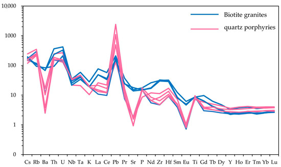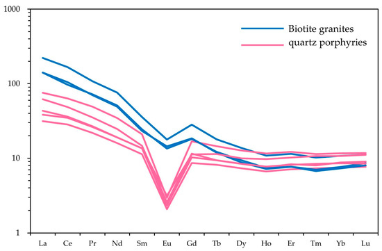 As shown in Table 1, the total rare earth element (REE) content in the biotite granites ranges from 148.9 × 10−⁶ to 236.7 × 10−⁶ ppm, with an average of 179.0 × 10−⁶ ppm. The LREE/HREE ratios range from 6.1 to 6.9, and the (La/Yb)N values range from 18.4 to 20.6, with an average of 19.4, indicating enrichment in light rare earth elements (LREEs). The total REE content of the quartz porphyry samples ranges from 54.0 × 10−⁶ to 121.2 × 10−⁶ ppm, with an average of 86.5 × 10−⁶ ppm. The LREE/HREE ratios range from 2.0 to 4.2, and the (La/Yb)N values range from 4.2 to 11.5, with an average of 6.8. In the REE distribution diagram (Figure 5), both granitoid types exhibit similar trends: LREEs are relatively enriched, HREEs are depleted, and Eu shows significant negative anomalies. The chondrite-normalized REE distribution curve is generally right-leaning.