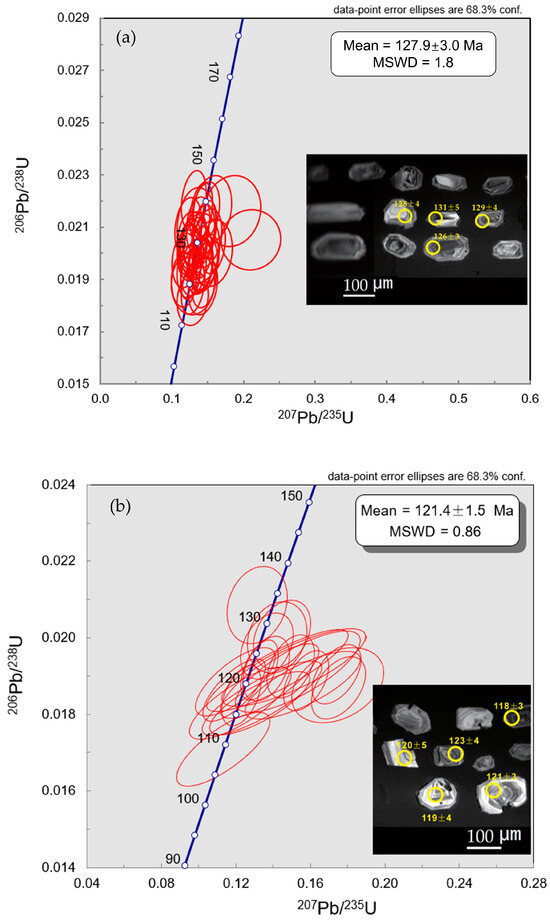 The zircon grains separated from the biotite granite and quartz porphyry samples are generally prismatic, colorless, transparent, and euhedral. The cathodoluminescence (CL) images clearly display microscale oscillatory zoning, indicating a magmatic origin (Figure 7a,b). The U–Pb zircon data show concordant results, with the biotite granite yielding a weighted mean 206Pb/238U age of 127.9 ± 3.0 Ma (MSWD = 1.8, Figure 7a), while the zircon grains from the quartz porphyry yield a U–Pb age of 121.4 ± 1.5 Ma (MSWD = 0.86, Figure 7b). These results suggest that the Jinchanshan biotite granite formed during the Early Cretaceous. The detailed zircon U–Pb isotopic data are presented in Table 2.