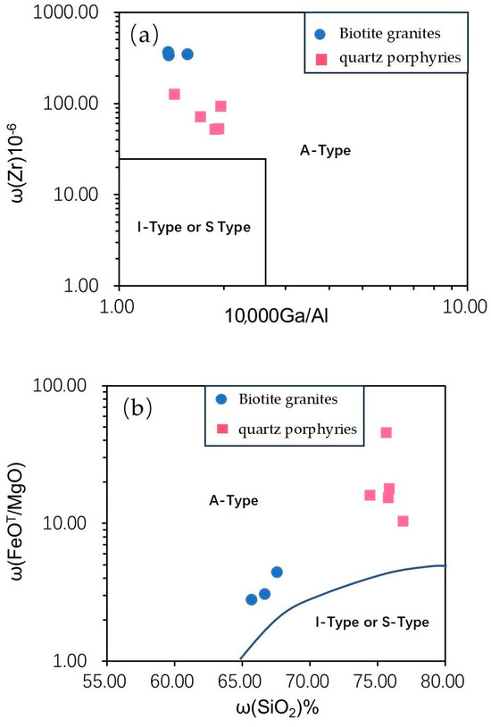 The discrimination diagrams for 10,000Ga/Al-Zr (Figure 8a) and 10,000Ga/Al-Y (Figure 8b) indicate that both granitoids exhibit an affinity for A-type granite. A-type granites are characterized by high FeOT content, FeOT/MgO, and FeOT/(FeOT + MgO) ratios, which are key indicators in distinguishing them from highly fractionated I-type granites [20]. The Jinchanshan granitoids have FeOT content ranging from 0.93% to 4.12%, significantly higher than the 0.5% observed in highly fractionated I-type granites [21]. Furthermore, these granitoids exhibit high FeOT/MgO ratios (3.08–45.98) and FeOT/(FeOT + MgO) ratios (0.74–0.98), placing them firmly within the A-type granite field on the rock type discrimination diagram (Figure 8c). These geochemical characteristics confirm that the studied granitoids are A-type granites.