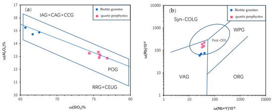 Al2O3-SiO2 tectonic discrimination diagram (a) modified from [25] and Rb-Y+Nb tectonic discrimination diagram (b) modified from [23] of major intrusive rocks from Jinchanshan gold deposit. IAG—island arc granitoids; CAG—continental arc granitoids; CCG—continental collision granitoids; POG—post-collisional granitoids; RRG—rift-related granitoids; CEUG—continental epeirogenic uplift granitoids; (b): syn-COLG—syncollision granites; VAG—volcanic arc granites; WPG—within-plate granites; ORG—ocean ride granites; post-CEG—post-collision extension granites.
