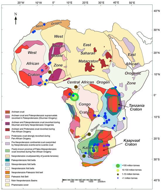 Simplified geological map showing manganese projects in Africa (after [3]; manganese project information from [4]).